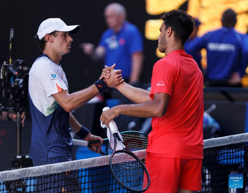 Alex de Minaur (L) greets Francisco Cerundolo after the men's singles 3rd round match between Alex de Minaur of Australia and Francisco Cerundolo of Argentina at Australian Open tennis tournament in Melbourne, Australia, Jan. 18, 2025. (Xinhua/Ma Ping)