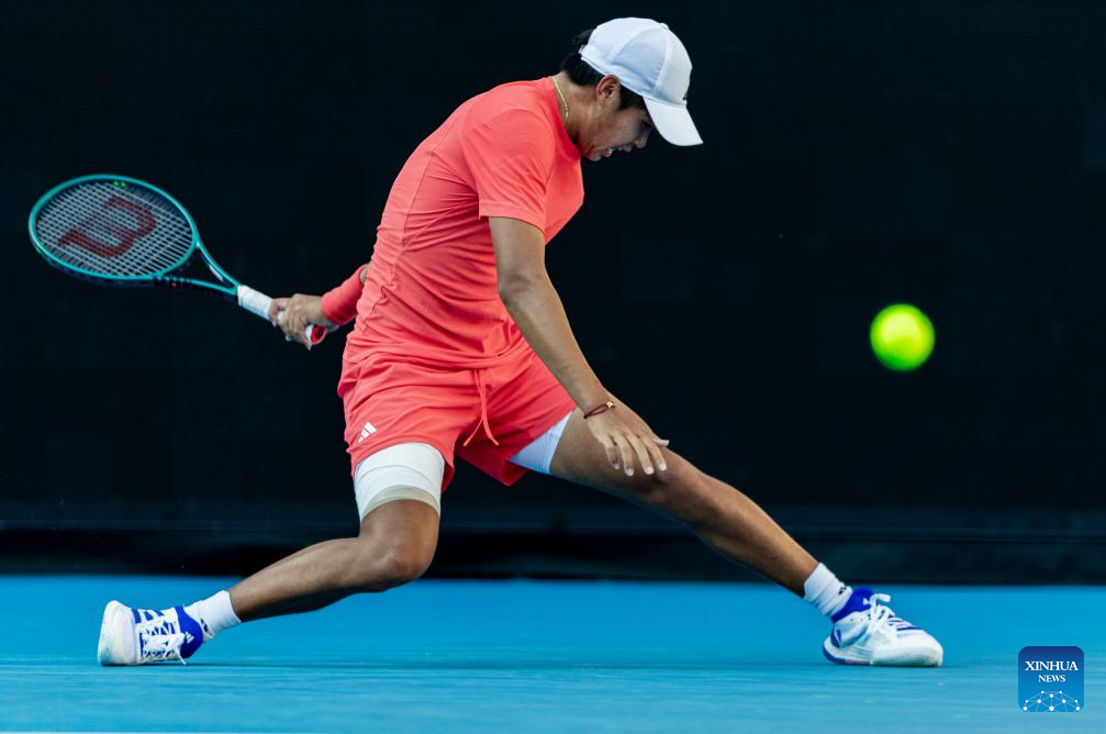 Learner Tien hits a return during the men's singles 3rd round match between Learner Tien of the United States and Corentin Moutet of France at Australian Open tennis tournament in Melbourne, Australia, Jan. 18, 2025. (Photo by Hu Jingchen/Xinhua)