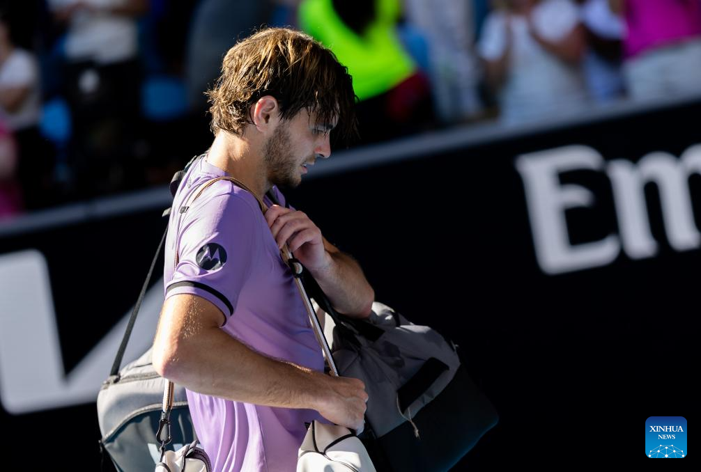 Taylor Fritz leaves the court after the men's singles 3rd round match between Taylor Fritz of the United States and Gael Monfils of France at Australian Open tennis tournament in Melbourne, Australia, Jan. 18, 2025. (Photo by Hu Jingchen/Xinhua)