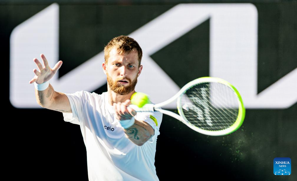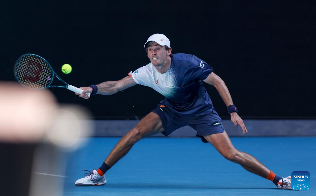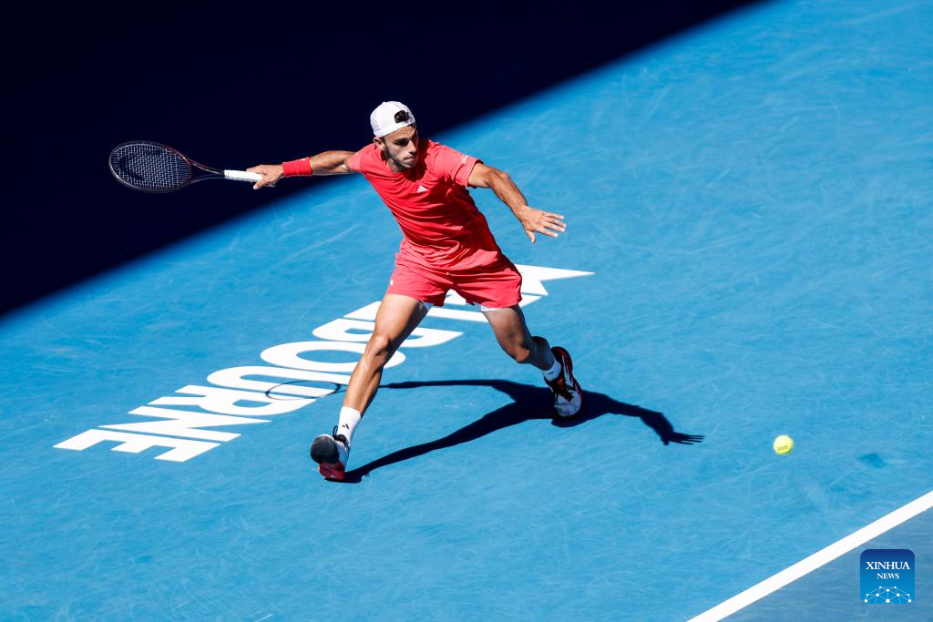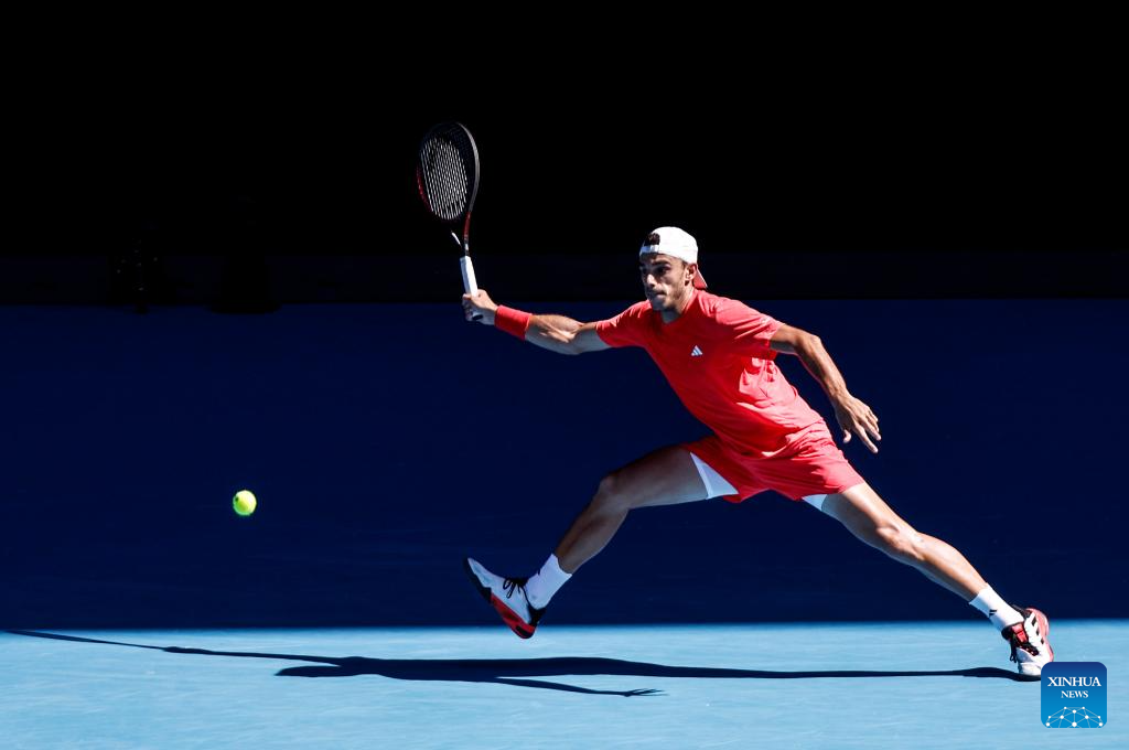 Francisco Cerundolo hits a return during the men's singles 3rd round match between Alex de Minaur of Australia and Francisco Cerundolo of Argentina at Australian Open tennis tournament in Melbourne, Australia, Jan. 18, 2025. (Xinhua/Ma Ping)