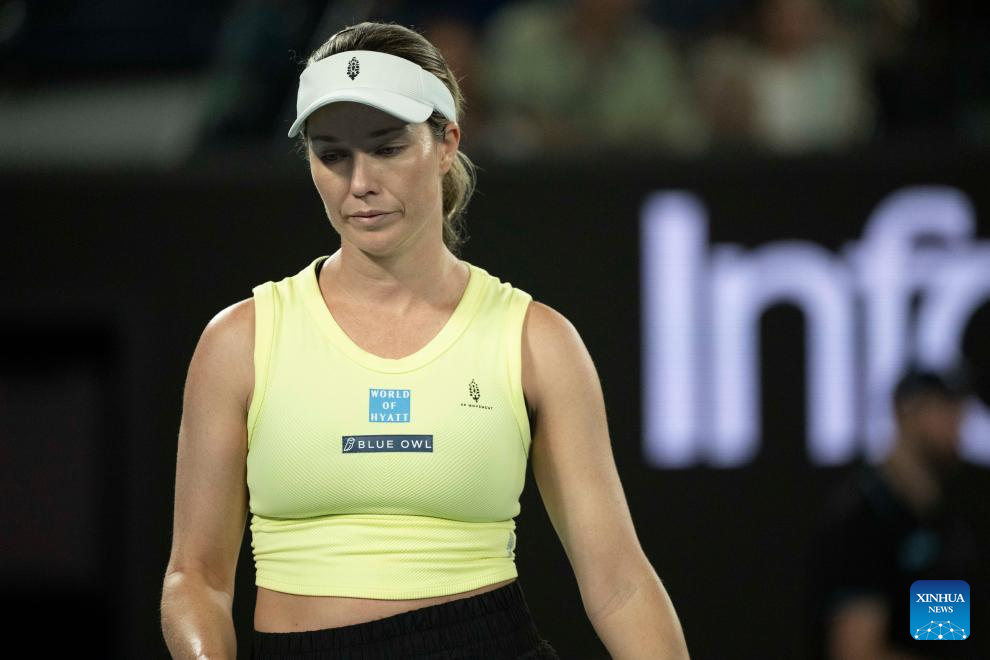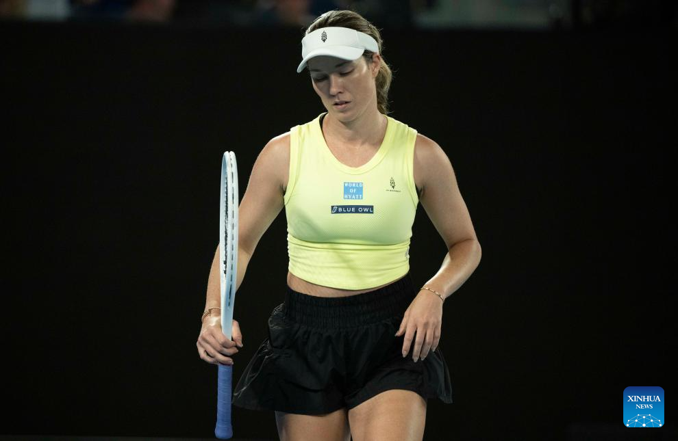 Danielle Collins reacts during the women's singles 3rd round match between Madison Keys of the United States and Danielle Collins of the United States at Australian Open tennis tournament in Melbourne, Australia, Jan. 18, 2025. (Xinhua/Lui Siu Wai)