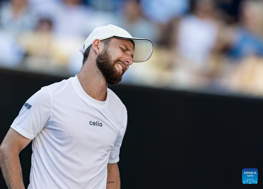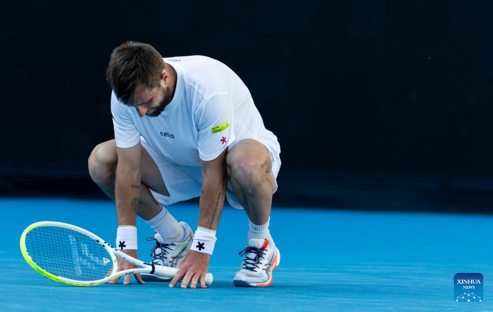 Corentin Moutet reacts during the men's singles 3rd round match between Learner Tien of the United States and Corentin Moutet of France at Australian Open tennis tournament in Melbourne, Australia, Jan. 18, 2025. (Photo by Hu Jingchen/Xinhua)