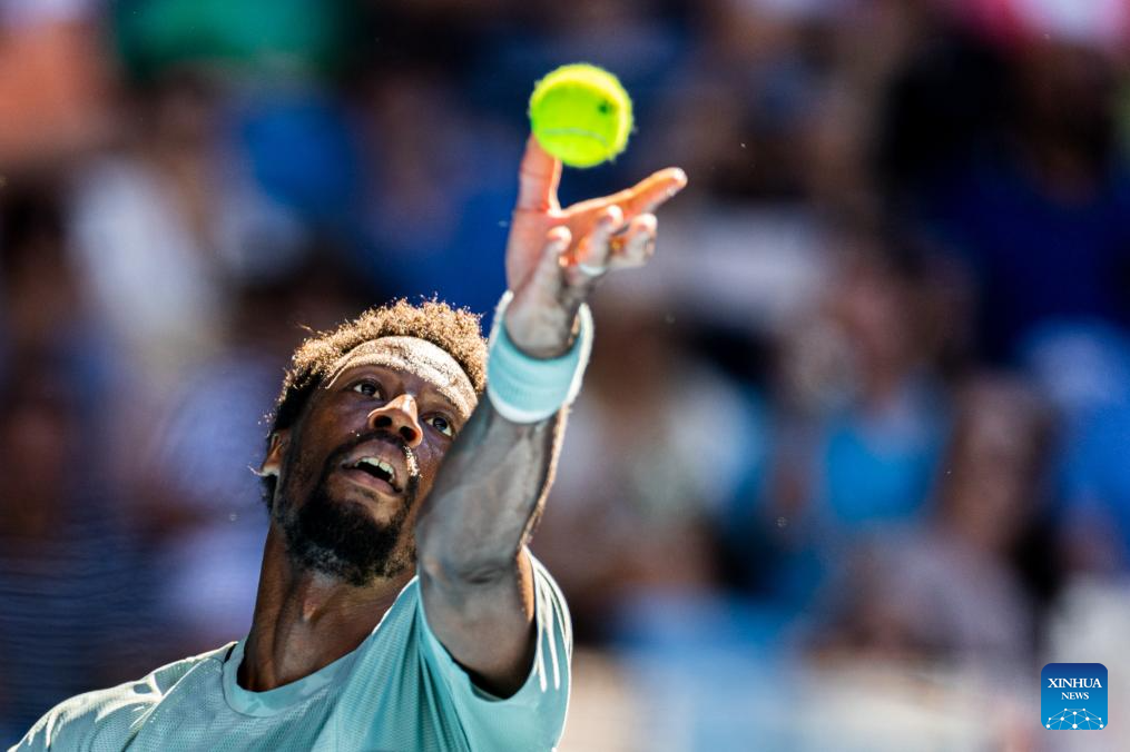 Gael Monfils serves during the men's singles 3rd round match between Taylor Fritz of the United States and Gael Monfils of France at Australian Open tennis tournament in Melbourne, Australia, Jan. 18, 2025. (Photo by Hu Jingchen/Xinhua)