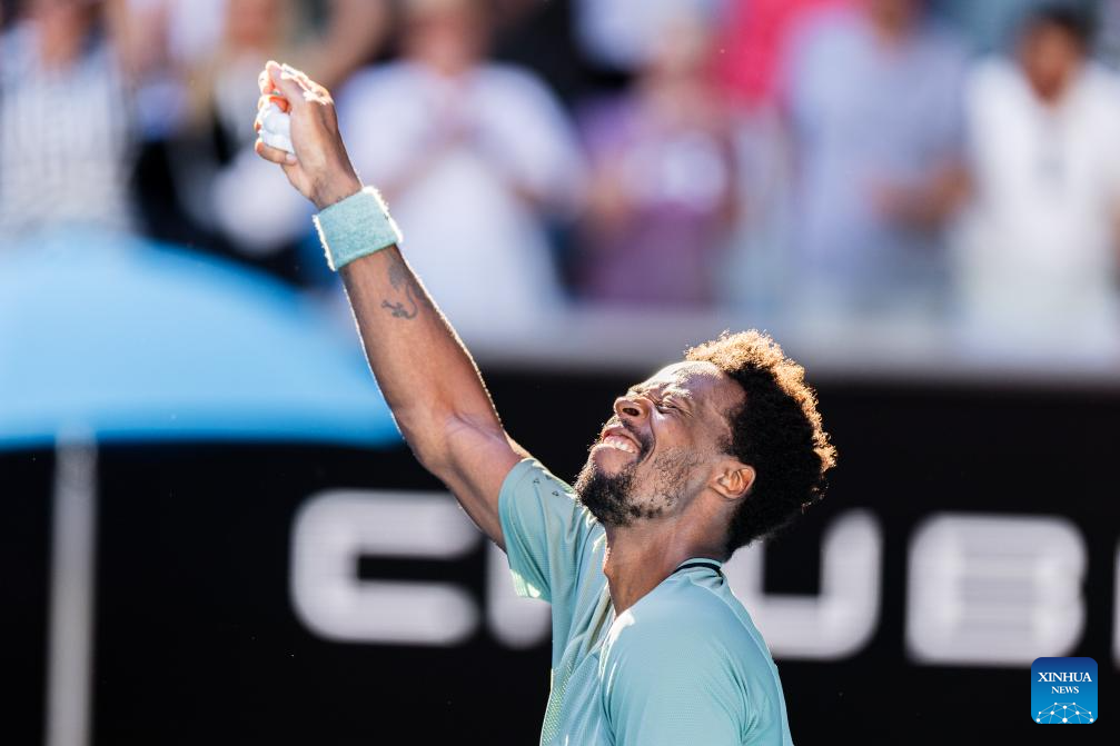 Gael Monfils celebrates after winning the men's singles 3rd round match between Taylor Fritz of the United States and Gael Monfils of France at Australian Open tennis tournament in Melbourne, Australia, Jan. 18, 2025. (Photo by Hu Jingchen/Xinhua)