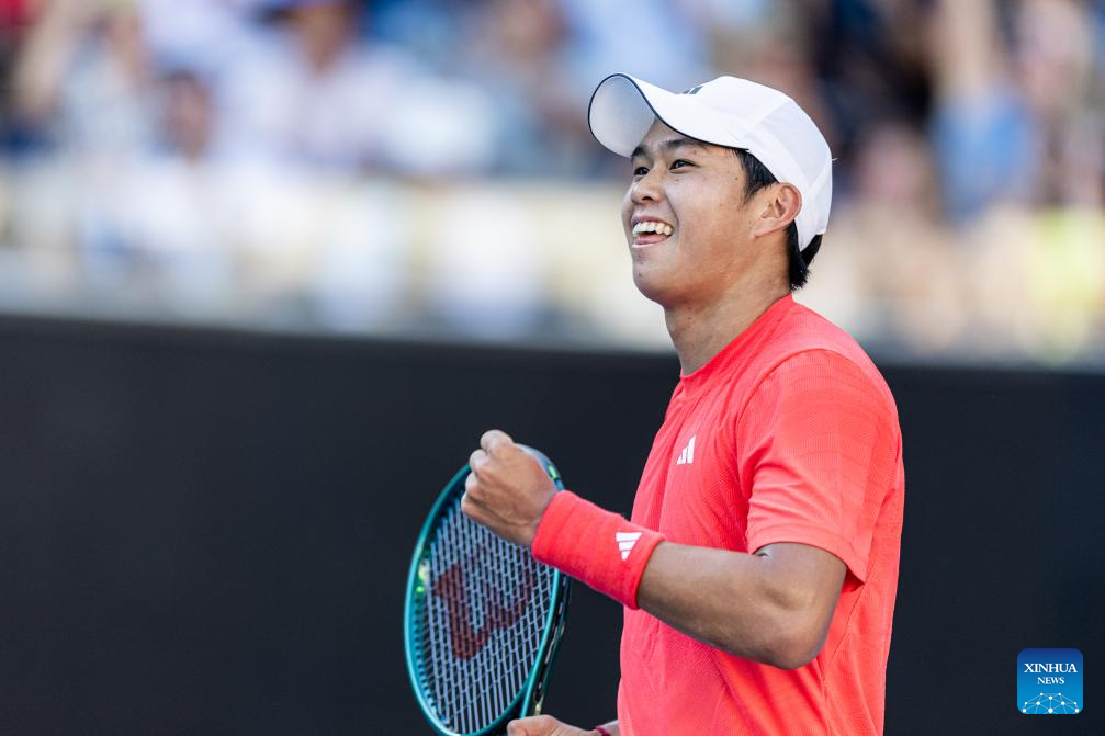 Learner Tien celebrates after the men's singles 3rd round match between Learner Tien of the United States and Corentin Moutet of France at Australian Open tennis tournament in Melbourne, Australia, Jan. 18, 2025. (Photo by Hu Jingchen/Xinhua)