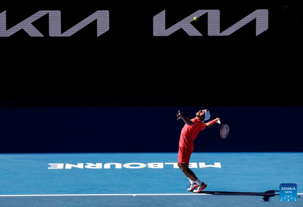 Taylor Fritz serves during the men's singles 3rd round match between Taylor Fritz of the United States and Gael Monfils of France at Australian Open tennis tournament in Melbourne, Australia, Jan. 18, 2025. (Photo by Hu Jingchen/Xinhua)