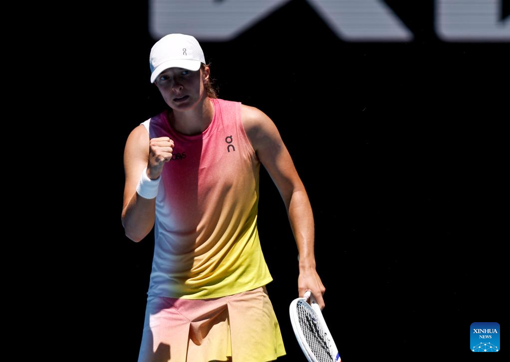 Iga Swiatek celebrates scoring during the women's singles 3rd round match between Iga Swiatek of Poland and Emma Raducanu of Britain at Australian Open tennis tournament in Melbourne, Australia, Jan. 18, 2025. (Xinhua/Ma Ping)