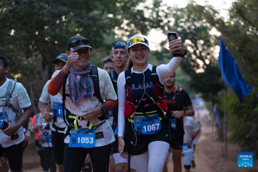 Runners take photos in the eighth Angkor Ultra Trail 100-km challenge at the UNESCO-listed Angkor Archaeological Park in Siem Reap province, Cambodia on Jan. 18, 2025. (Photo by Sao Khuth/Xinhua)