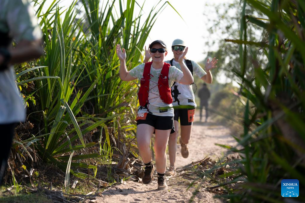 Runners react in the eighth Angkor Ultra Trail 100-km challenge at the UNESCO-listed Angkor Archaeological Park in Siem Reap province, Cambodia on Jan. 18, 2025. (Photo by Sao Khuth/Xinhua)