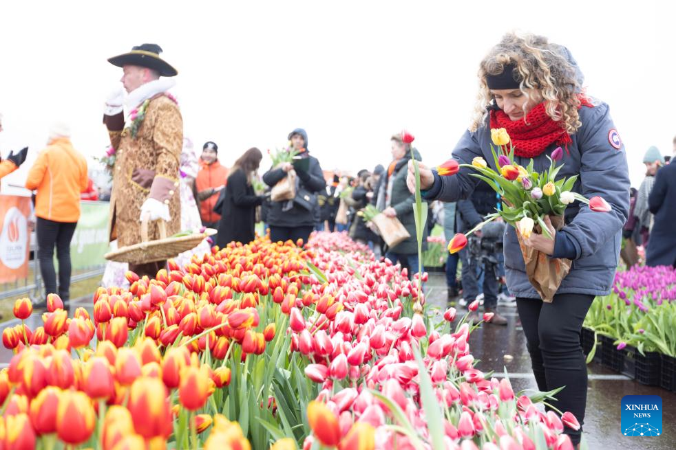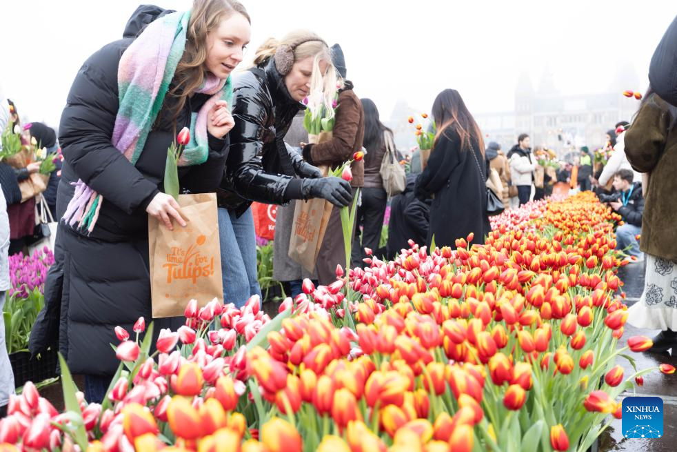 People pick tulips at a picking garden on the Museum Square in Amsterdam, the Netherlands, Jan. 18, 2025. People celebrated the National Tulip Day on Saturday, which is traditionally marked on the third Saturday of the year. (Photo by Sylvia Lederer/Xinhua)