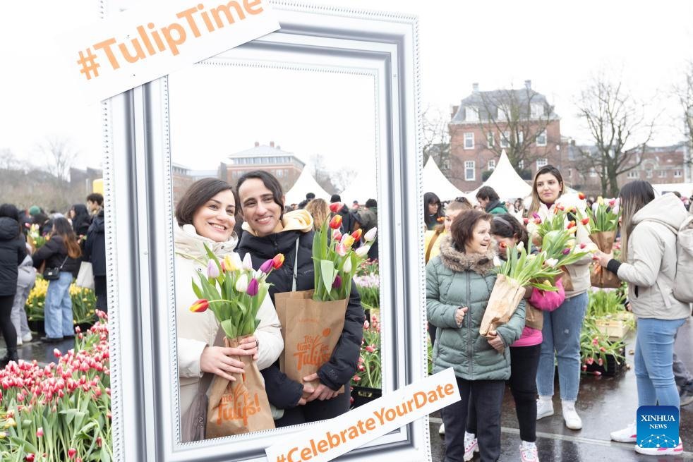 People holding bunches of tulips pose for photos at a picking garden on the Museum Square in Amsterdam, the Netherlands, Jan. 18, 2025. People celebrated the National Tulip Day on Saturday, which is traditionally marked on the third Saturday of the year. (Photo by Sylvia Lederer/Xinhua)