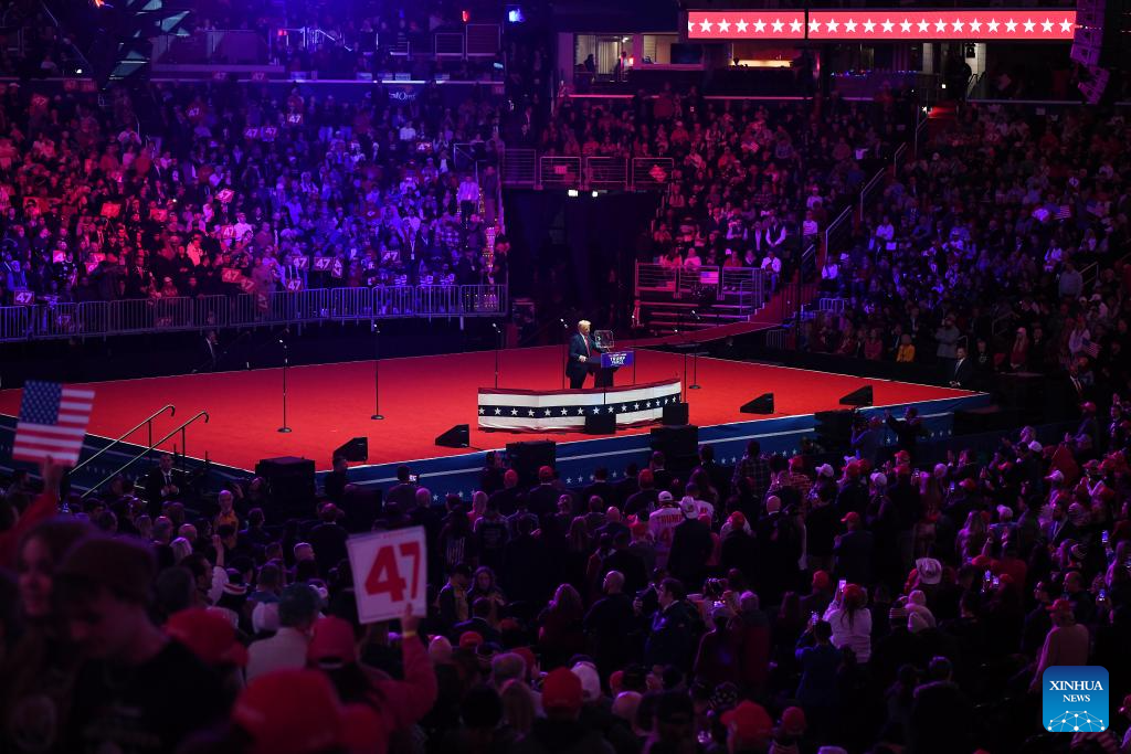 U.S. President-elect Donald Trump addresses a victory rally held at Capital One Arena in Washington, D.C., the United States, Jan. 19, 2025. The inauguration ceremony of U.S. President-elect Donald Trump will be held in Washington, D.C. on Monday. (Xinhua/Li Rui)