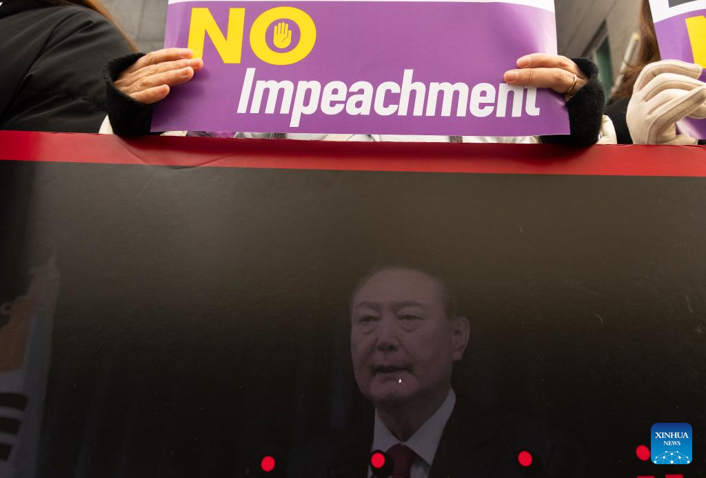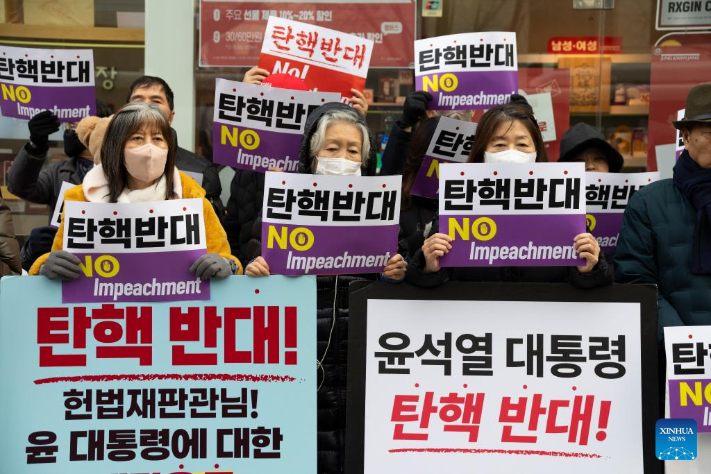 Supporters of arrested President Yoon Suk-yeol gather in a rally near the Constitutional Court in Seoul, South Korea, Jan. 21, 2025. South Korea's arrested President Yoon Suk-yeol attended the third formal hearing of his impeachment trial at the constitutional court in Seoul on Tuesday. (Photo by Jun Hyosang/Xinhua)