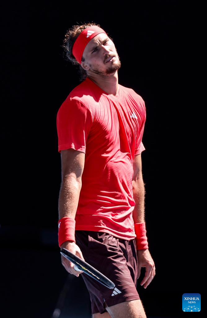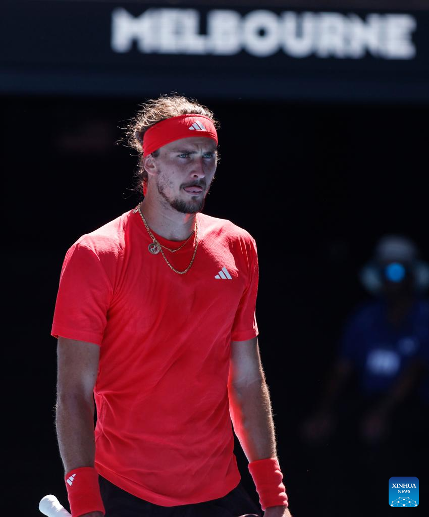 Alexander Zverev reacts during the men's singles quarterfinal match between Alexander Zverev of Germany and Tommy Paul of the United States at Australian Open tennis tournament in Melbourne, Australia, Jan. 21, 2025. (Xinhua/Ma Ping)