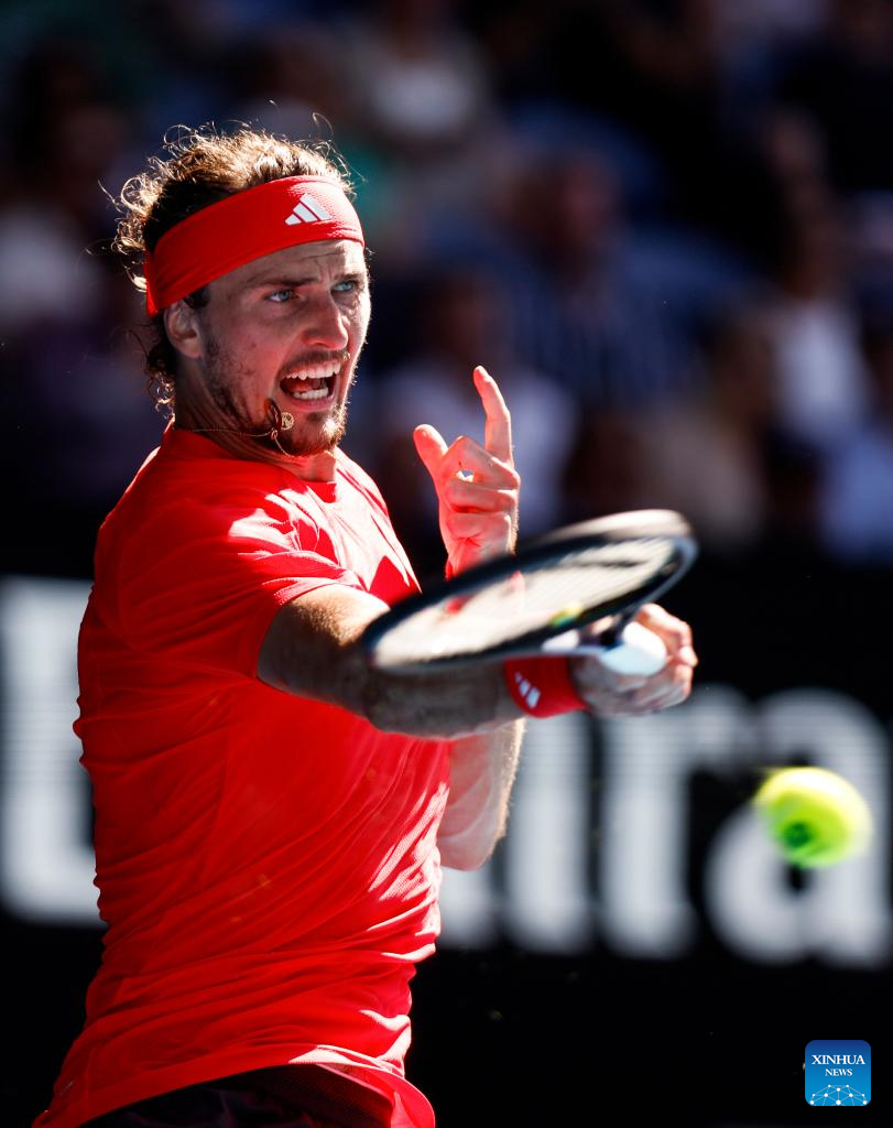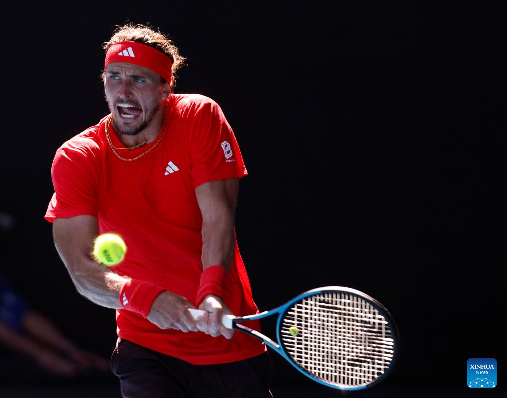 Alexander Zverev hits a return during the men's singles quarterfinal match between Alexander Zverev of Germany and Tommy Paul of the United States at Australian Open tennis tournament in Melbourne, Australia, Jan. 21, 2025. (Xinhua/Ma Ping)