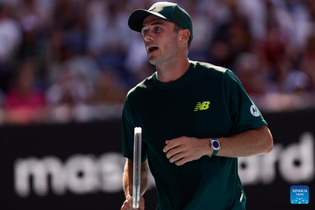 Tommy Paul reacts during the men's singles quarterfinal match between Alexander Zverev of Germany and Tommy Paul of the United States at Australian Open tennis tournament in Melbourne, Australia, Jan. 21, 2025. (Xinhua/Ma Ping)