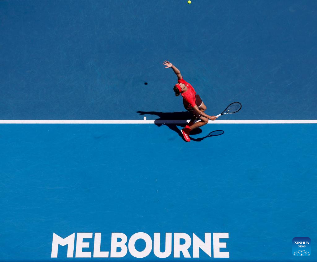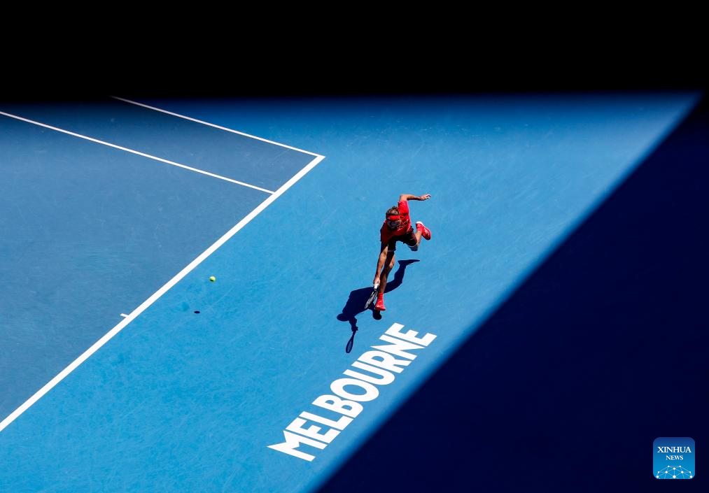 Alexander Zverev serves during the men's singles quarterfinal match between Alexander Zverev of Germany and Tommy Paul of the United States at Australian Open tennis tournament in Melbourne, Australia, Jan. 21, 2025. (Xinhua/Ma Ping)