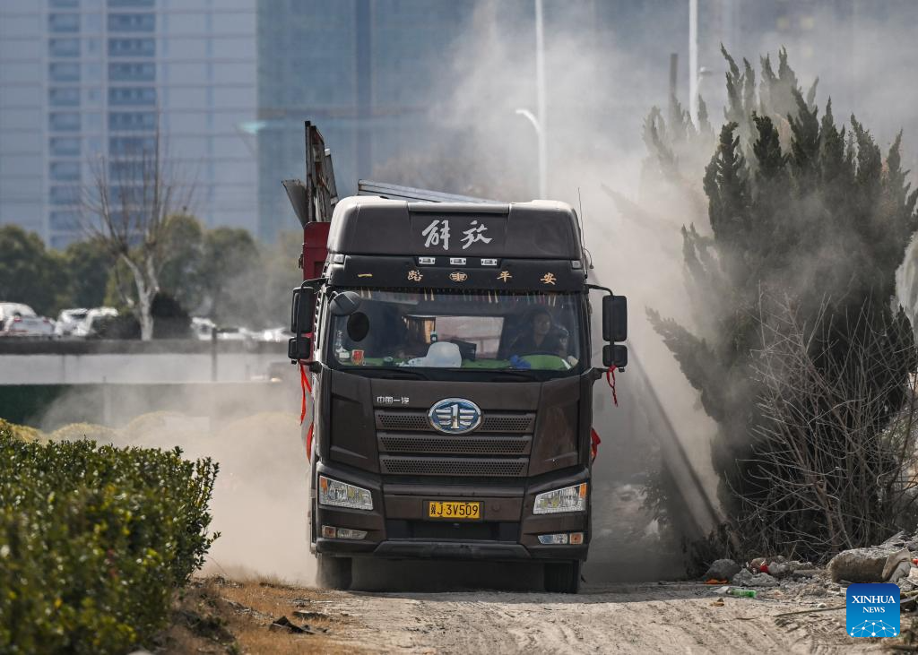 Kong Lingjian (R) and his wife depart from a construction site after loading cargo onto their truck in Hangzhou, east China's Zhejiang Province, Jan. 16, 2025. On regular days, truck driver Kong Lingjian and his wife Wang Yanqing mainly transport goods between Hangzhou of east China's Zhejiang Province and the areas around Wuhan of central China's Hubei Province. To save expenses, they live in their truck year-round. For the couple, the truck is their second home.(Xinhua/Chen Yehua)
