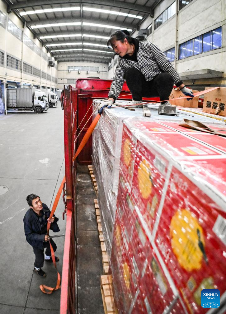 Kong Lingjian (L) and his wife Wang Yanqing load cargo onto their truck at a company in Hangzhou, east China's Zhejiang Province, Jan. 13, 2025. On regular days, truck driver Kong Lingjian and his wife Wang Yanqing mainly transport goods between Hangzhou of east China's Zhejiang Province and the areas around Wuhan of central China's Hubei Province. To save expenses, they live in their truck year-round. For the couple, the truck is their second home. (Xinhua/Chen Yehua)