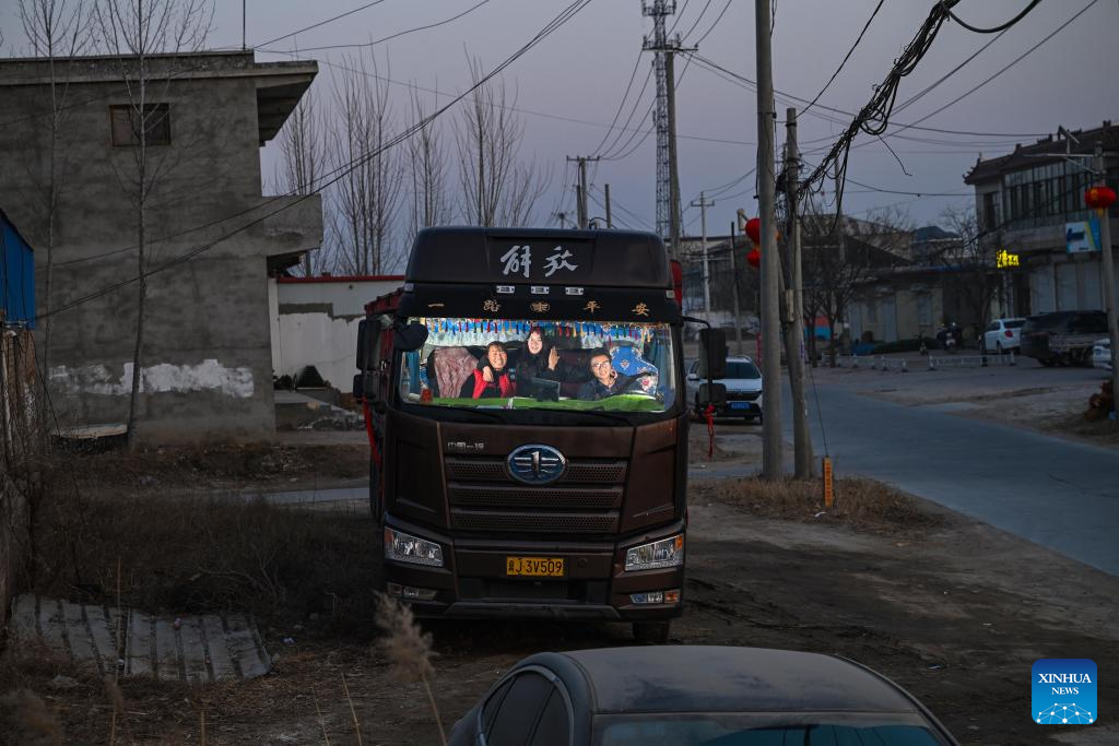Kong Lingjian (R) poses for a photo with his wife (L) and younger daughter in Zhongying Village of Cangzhou City, north China's Hebei Province, Jan. 20, 2025. On regular days, truck driver Kong Lingjian and his wife Wang Yanqing mainly transport goods between Hangzhou of east China's Zhejiang Province and the areas around Wuhan of central China's Hubei Province. To save expenses, they live in their truck year-round. For the couple, the truck is their second home.(Xinhua/Chen Yehua)