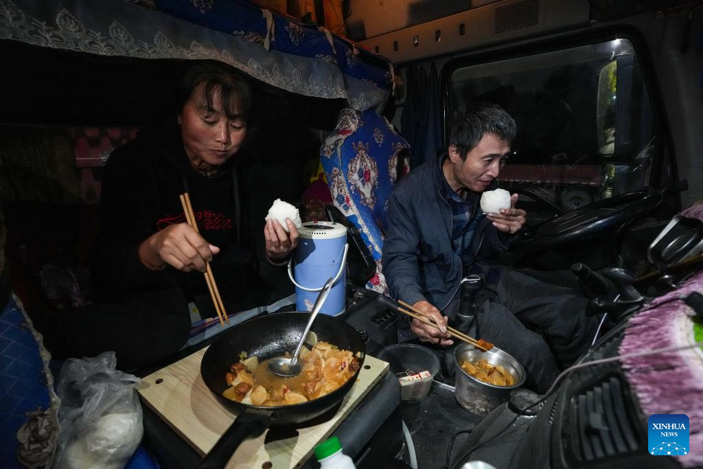 Kong Lingjian (R) and his wife Wang Yanqing eat in the truck in Hangzhou, east China's Zhejiang Province, Jan. 16, 2025. On regular days, truck driver Kong Lingjian and his wife Wang Yanqing mainly transport goods between Hangzhou of east China's Zhejiang Province and the areas around Wuhan of central China's Hubei Province. To save expenses, they live in their truck year-round. For the couple, the truck is their second home.(Xinhua/Chen Yehua)