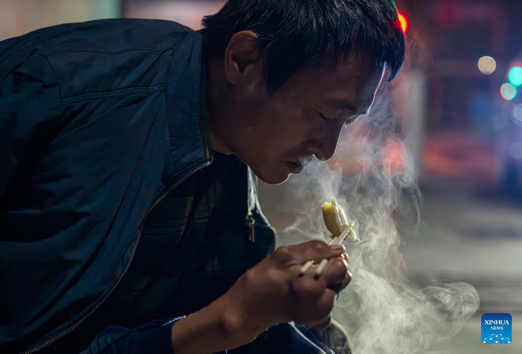Kong Lingjian eats dumplings while waiting for work on the roadside in Hangzhou, east China's Zhejiang Province, Jan. 12, 2025. On regular days, truck driver Kong Lingjian and his wife Wang Yanqing mainly transport goods between Hangzhou of east China's Zhejiang Province and the areas around Wuhan of central China's Hubei Province. To save expenses, they live in their truck year-round. For the couple, the truck is their second home.