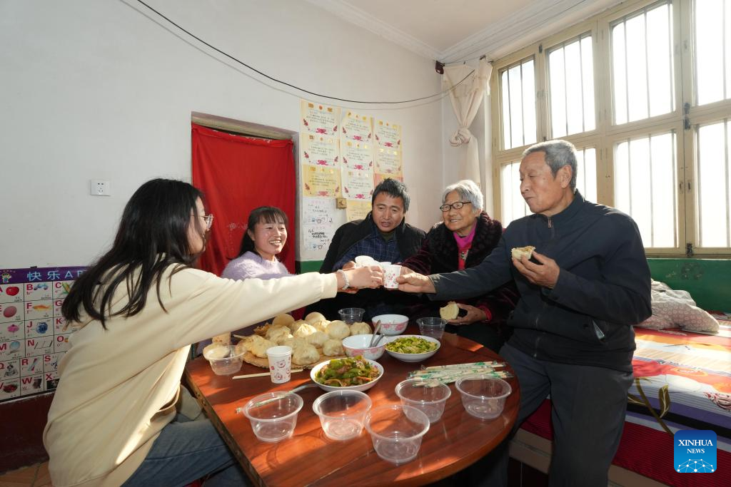 Kong Lingjian (C) shares a meal with his wife, parents and younger daughter at home in Zhongying Village of Cangzhou City, north China's Hebei Province, Jan. 21, 2025. On regular days, truck driver Kong Lingjian and his wife Wang Yanqing mainly transport goods between Hangzhou of east China's Zhejiang Province and the areas around Wuhan of central China's Hubei Province. To save expenses, they live in their truck year-round. For the couple, the truck is their second home.(Xinhua/Chen Yehua)