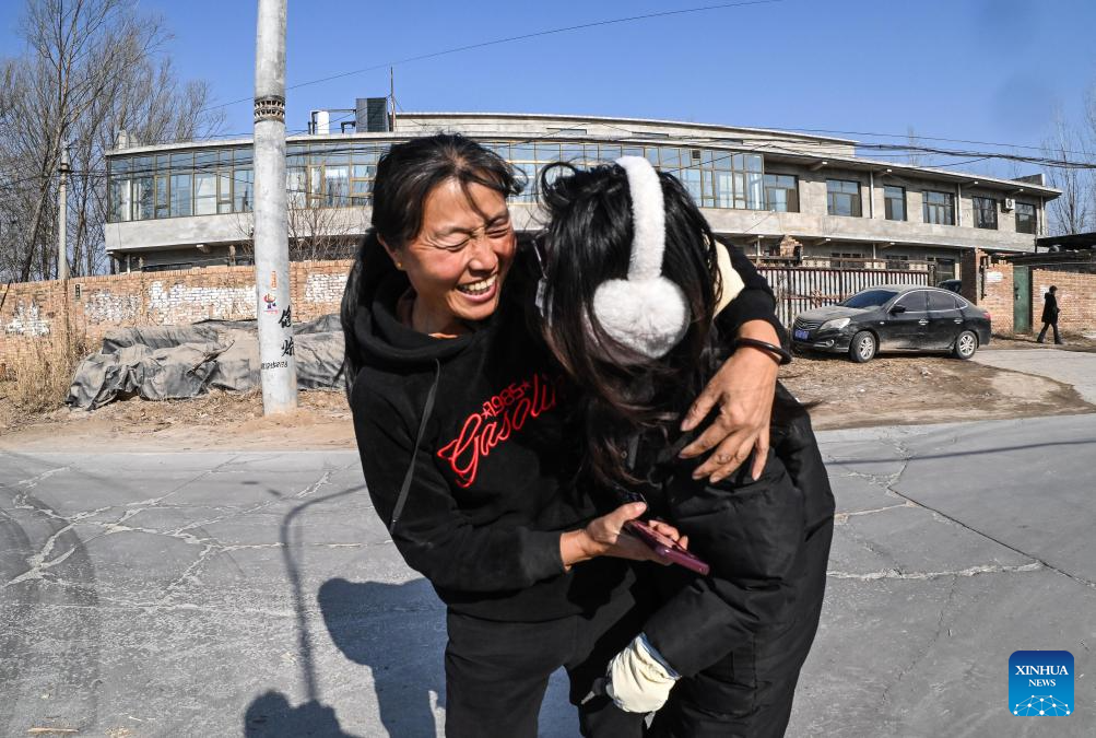 Wang Yanqing (L) hugs her younger daughter who waits for their arrival at the entrance to Zhongying Village of Cangzhou City, north China's Hebei Province, Jan. 20, 2025. On regular days, truck driver Kong Lingjian and his wife Wang Yanqing mainly transport goods between Hangzhou of east China's Zhejiang Province and the areas around Wuhan of central China's Hubei Province. To save expenses, they live in their truck year-round. For the couple, the truck is their second home.(Xinhua/Chen Yehua)