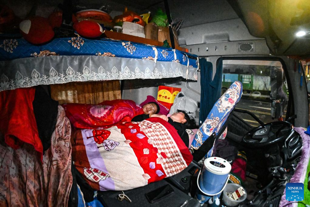 Kong Lingjian (L) and his wife Wang Yanqing sleep in the truck in Hangzhou, east China's Zhejiang Province, Jan. 12, 2025. On regular days, truck driver Kong Lingjian and his wife Wang Yanqing mainly transport goods between Hangzhou of east China's Zhejiang Province and the areas around Wuhan of central China's Hubei Province. To save expenses, they live in their truck year-round. For the couple, the truck is their second home.(Xinhua/Chen Yehua)