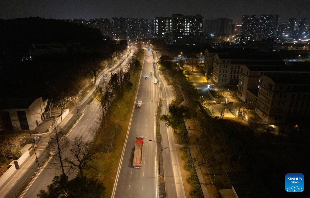An aerial drone photo taken on Jan. 13, 2025 shows Kong Lingjian and his wife driving on a road in Hangzhou, east China's Zhejiang Province. On regular days, truck driver Kong Lingjian and his wife Wang Yanqing mainly transport goods between Hangzhou of east China's Zhejiang Province and the areas around Wuhan of central China's Hubei Province. To save expenses, they live in their truck year-round. For the couple, the truck is their second home.(Xinhua/Cai Yang)