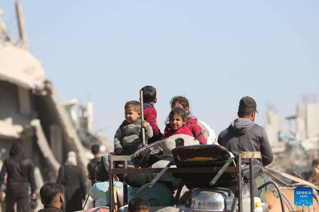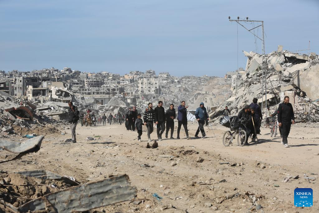Palestinians are pictured on their way back to north Gaza Strip, in Gaza City, on Jan. 21, 2025. A tense ceasefire agreement between Israel and Hamas took effect on Sunday, initiating six weeks of calm and raising hopes for an end to 15 months of Israeli assaults on Gaza that devastated the enclave and for the release of dozens of hostages held there. (Photo by Abdul Rahman Salama/Xinhua)
