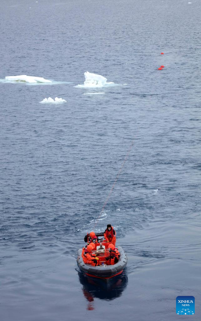 Members of China's 41st Antarctic expedition team work on a boat in the Amundsen Sea on Jan. 19, 2025. Chinese research icebreaker Xuelong 2, or Snow Dragon 2, is conducting a month-long marine ecosystem survey in the Amundsen Sea, which include a comprehensive investigation and monitoring of biological ecology, water, sedimentary and atmospheric environment, and pollutant distribution.