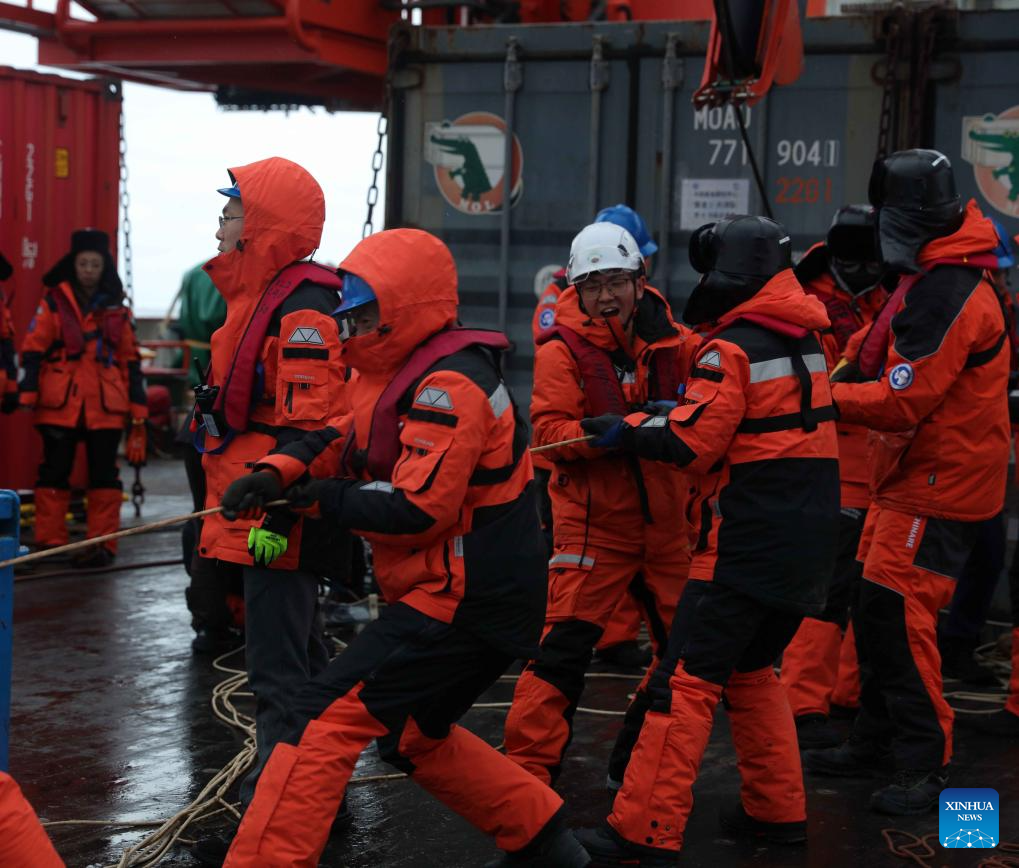 Members of China's 41st Antarctic expedition team work on board of Chinese research icebreaker Xuelong 2, Jan. 19, 2025. Chinese research icebreaker Xuelong 2, or Snow Dragon 2, is conducting a month-long marine ecosystem survey in the Amundsen Sea, which include a comprehensive investigation and monitoring of biological ecology, water, sedimentary and atmospheric environment, and pollutant distribution.