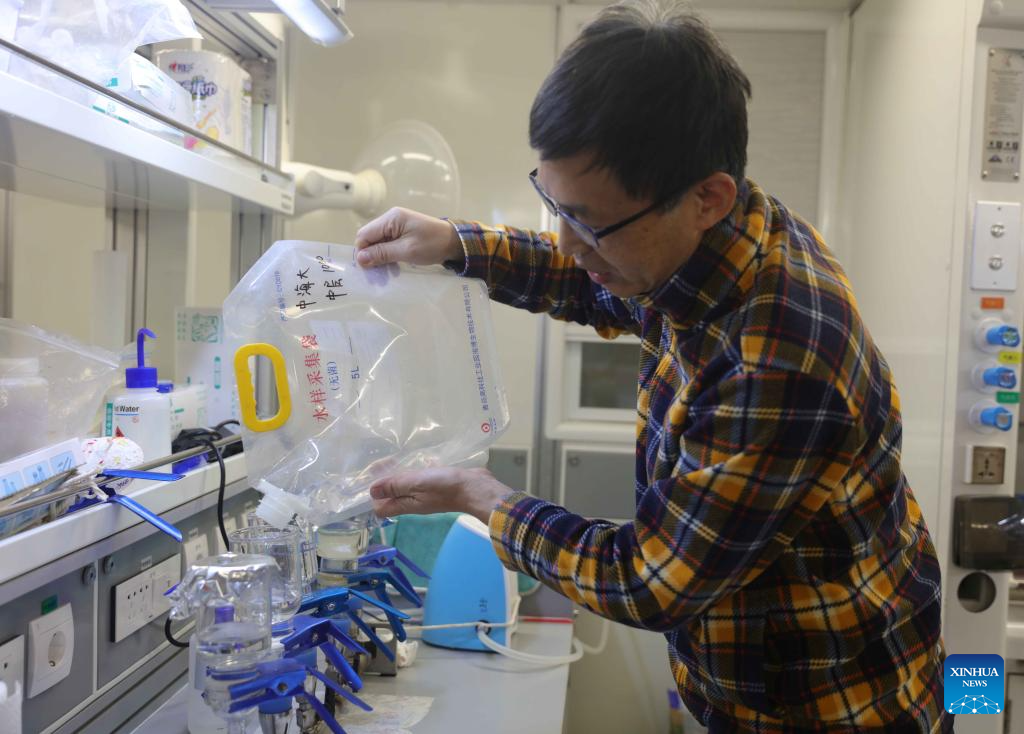 A member of China's 41st Antarctic expedition team filters the water sample on Chinese research icebreaker Xuelong 2, Jan. 22, 2025. Chinese research icebreaker Xuelong 2, or Snow Dragon 2, is conducting a month-long marine ecosystem survey in the Amundsen Sea, which include a comprehensive investigation and monitoring of biological ecology, water, sedimentary and atmospheric environment, and pollutant distribution.