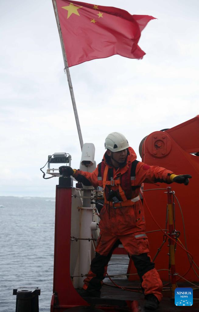 A member of China's 41st Antarctic expedition team works on board of Chinese research icebreaker Xuelong 2, Jan. 19, 2025. Chinese research icebreaker Xuelong 2, or Snow Dragon 2, is conducting a month-long marine ecosystem survey in the Amundsen Sea, which include a comprehensive investigation and monitoring of biological ecology, water, sedimentary and atmospheric environment, and pollutant distribution.