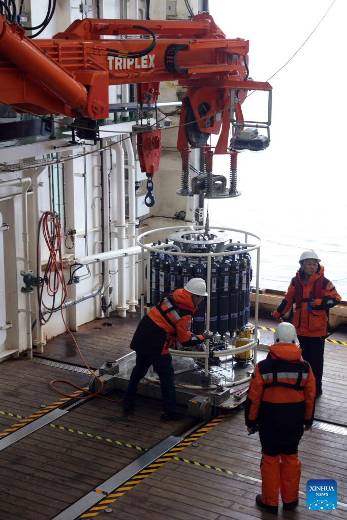 Members of China's 41st Antarctic expedition team prepare to deploy a Conductivity, Temperature, and Depth (CTD) instrument on Chinese research icebreaker Xuelong 2, Jan. 18, 2025. Chinese research icebreaker Xuelong 2, or Snow Dragon 2, is conducting a month-long marine ecosystem survey in the Amundsen Sea, which include a comprehensive investigation and monitoring of biological ecology, water, sedimentary and atmospheric environment, and pollutant distribution.