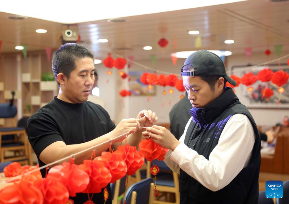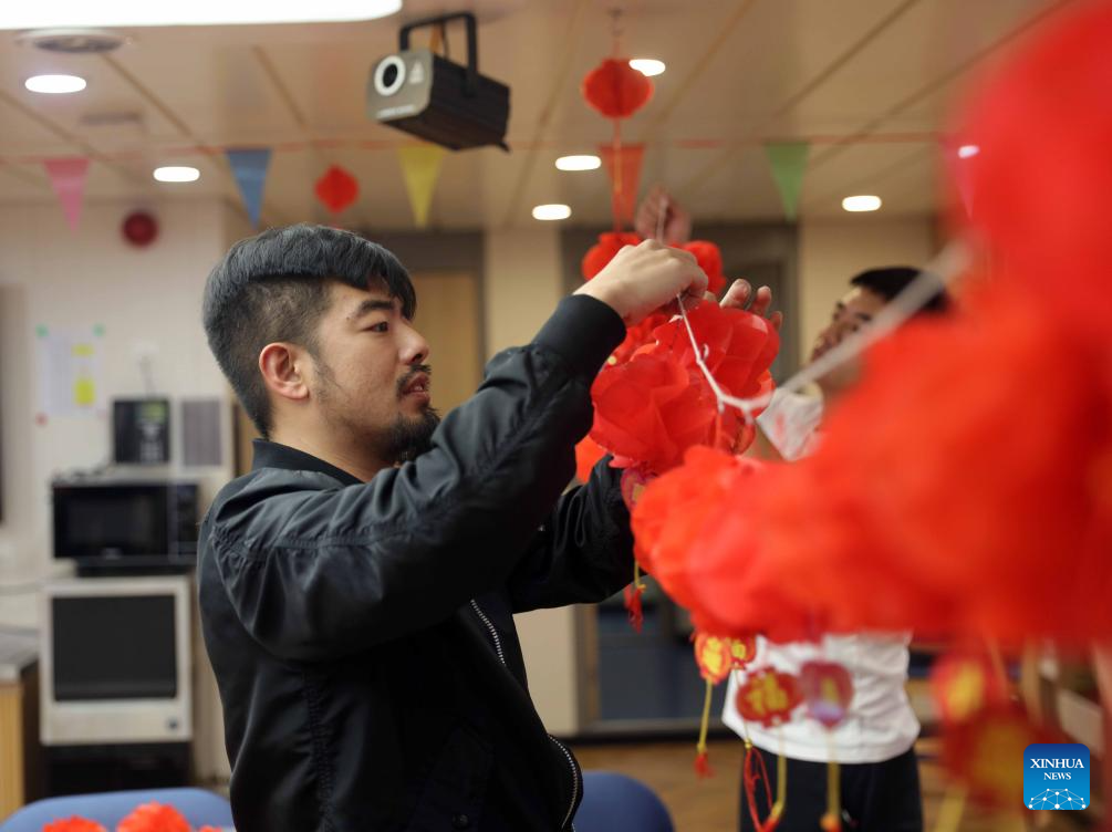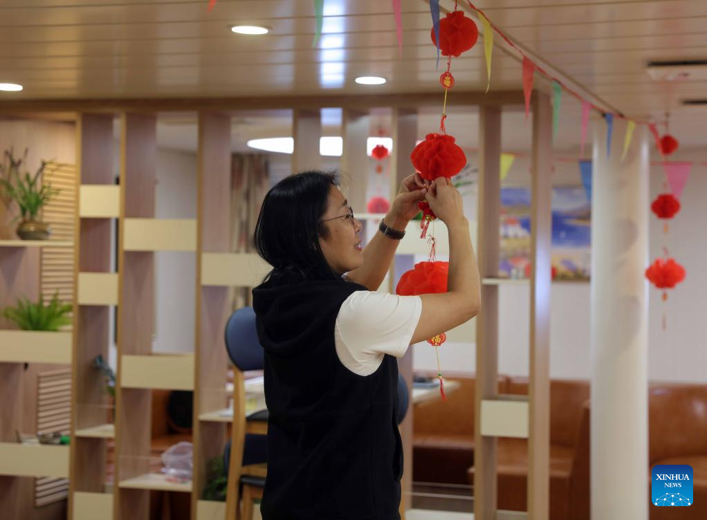 Members of the expedition team decorated the vessel to greet the upcoming Spring Festival. (Xinhua/Huang Taoming)