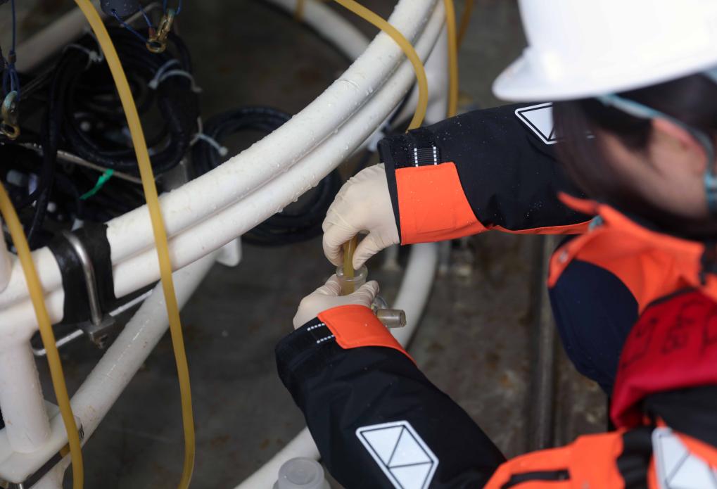 A member of China's 41st Antarctic expedition team collects water sample from a Conductivity, Temperature, and Depth (CTD) instrument on Chinese research icebreaker Xuelong 2, Jan. 18, 2025. Chinese research icebreaker Xuelong 2, or Snow Dragon 2, is conducting a month-long marine ecosystem survey in the Amundsen Sea, which include a comprehensive investigation and monitoring of biological ecology, water, sedimentary and atmospheric environment, and pollutant distribution.