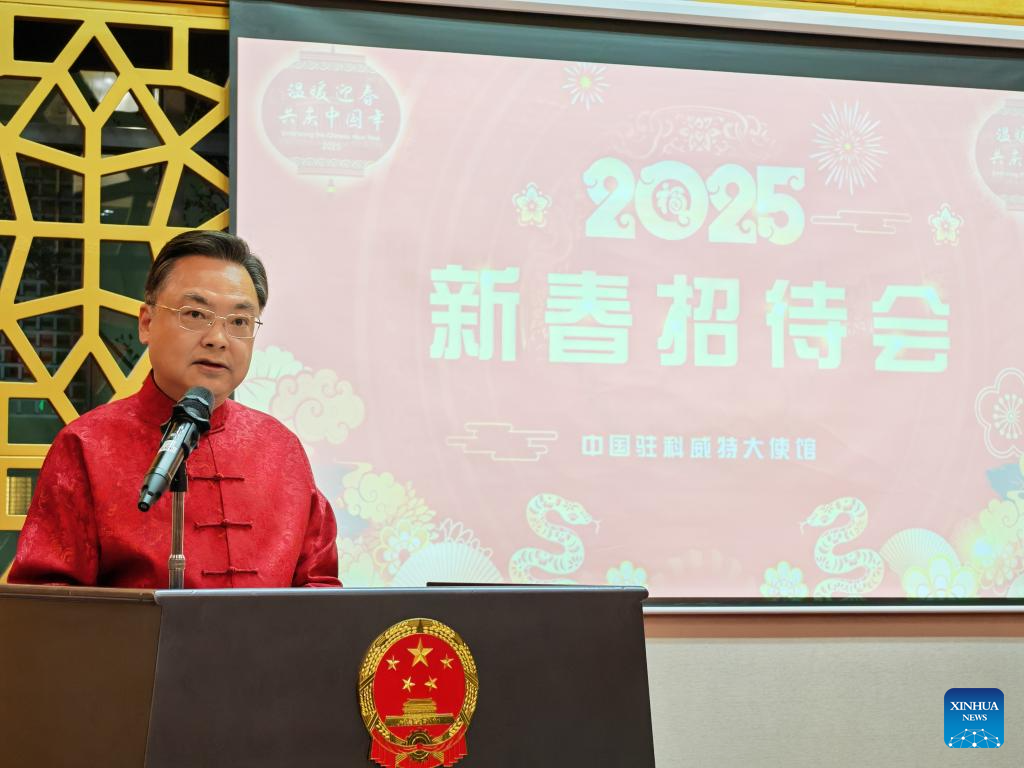 Chinese Ambassador to Kuwait Zhang Jianwei speaks during an event to mark the upcoming Chinese Lunar New Year in Hawalli Governorate, Kuwait, Jan. 23, 2025. The event was hosted by the Chinese embassy in Kuwait on Thursday evening. (Photo by Hu Tiancan/Xinhua)