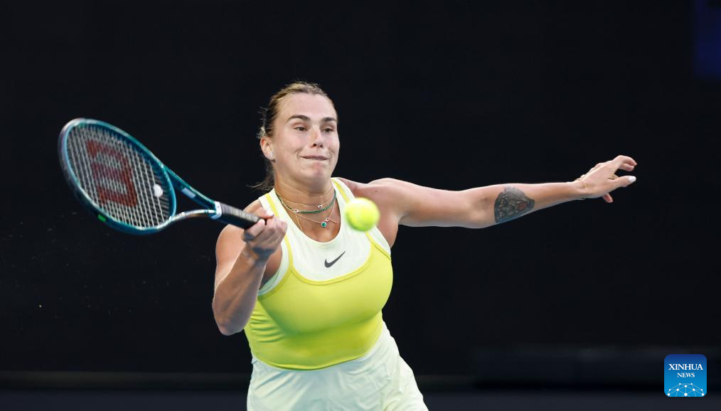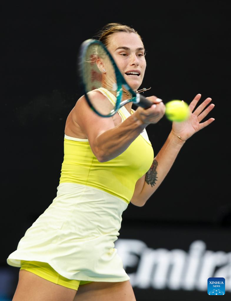 Aryna Sabalenka hits a return during the women's singles final between Aryna Sabalenka of Belarus and Madison Keys of the United States at Australian Open tennis tournament in Melbourne, Australia, Jan. 25, 2025. (Xinhua/Ma Ping)