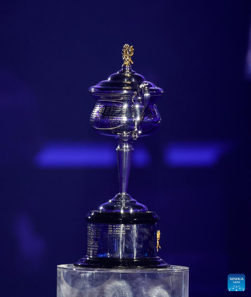The trophy is seen before the women's singles final between Aryna Sabalenka of Belarus and Madison Keys of the United States at Australian Open tennis tournament in Melbourne, Australia, Jan. 25, 2025. (Xinhua/Ma Ping)