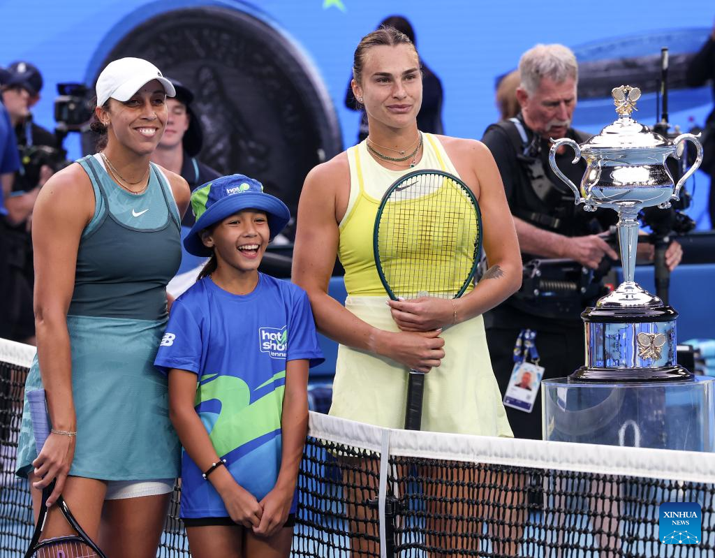 Aryna Sabalenka (R) and Madison Keys (L) pose for photos before the women's singles final between Aryna Sabalenka of Belarus and Madison Keys of the United States at Australian Open tennis tournament in Melbourne, Australia, Jan. 25, 2025. (Xinhua/Ma Ping)