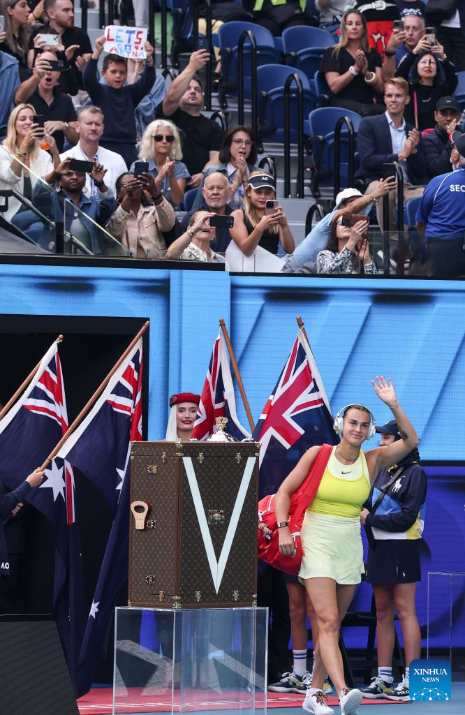Aryna Sabalenka greets the spectators before the women's singles final between Aryna Sabalenka of Belarus and Madison Keys of the United States at Australian Open tennis tournament in Melbourne, Australia, Jan. 25, 2025. (Xinhua/Ma Ping)
