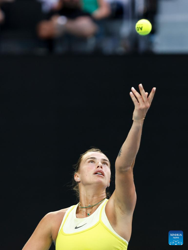 Aryna Sabalenka serves during the women's singles final between Aryna Sabalenka of Belarus and Madison Keys of the United States at Australian Open tennis tournament in Melbourne, Australia, Jan. 25, 2025. (Xinhua/Ma Ping)