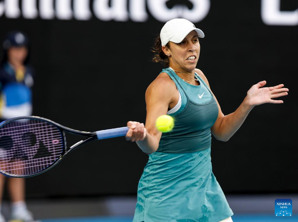 Madison Keys hits a return during the women's singles final between Aryna Sabalenka of Belarus and Madison Keys of the United States at Australian Open tennis tournament in Melbourne, Australia, Jan. 25, 2025. (Xinhua/Ma Ping)