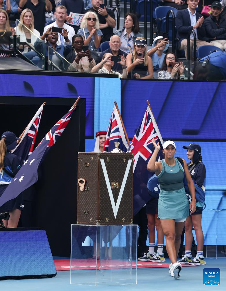 Madison Keys greets the spectators before the women's singles final between Aryna Sabalenka of Belarus and Madison Keys of the United States at Australian Open tennis tournament in Melbourne, Australia, Jan. 25, 2025. (Xinhua/Ma Ping)