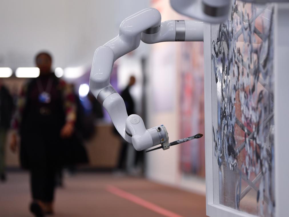 A painting robotic arm is pictured at the Congress Center for the World Economic Forum (WEF) Annual Meeting in Davos, Switzerland, Jan. 23, 2025. (Xinhua/Lian Yi)