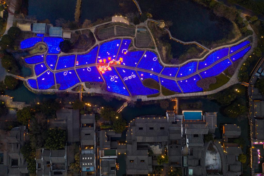 An aerial drone photo shows lantern installations during a floating lantern fair in Wuzhen, east China's Zhejiang Province, Jan. 23, 2025. (Xinhua/Xu Yu)