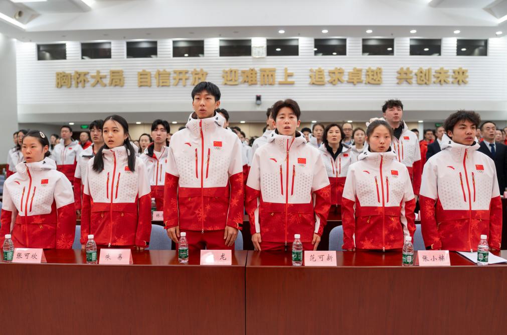 Members of China's 257-member delegation for the 9th Asian Winter Games Harbin 2025 sing the national anthem during the inaugural meeting of the squad in Beijing, capital of China, Jan. 24, 2025. (Xinhua/Sun Fei)