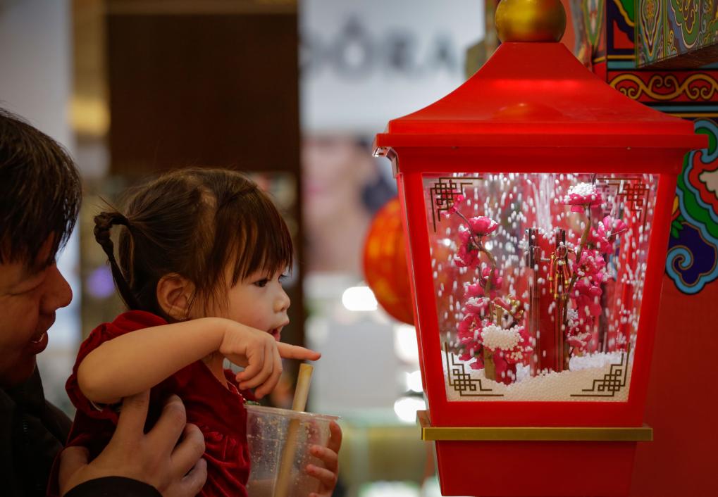 A child takes a close look at a festive decoration at the 2025 Chinese Lunar New Year Flower and Gift Fair in Richmond, British Columbia, Canada, Jan. 23, 2025. (Photo by Liang Sen/Xinhua)